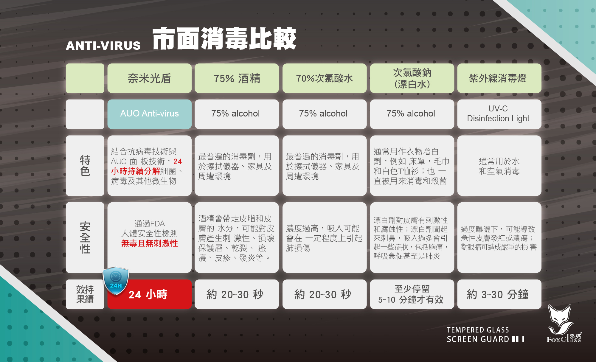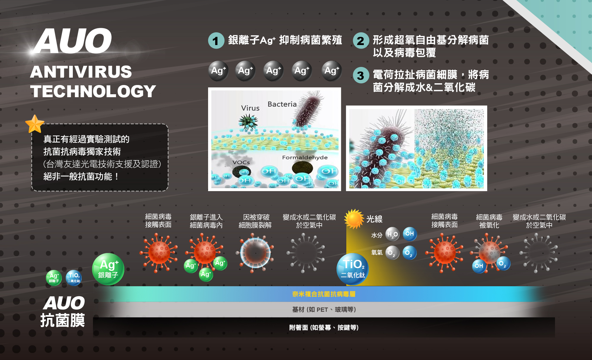 ●獨家採用【台灣面板大廠友達光電AUO 】抗病毒及抗菌技術(奈米銀離子及二氧化鈦)。